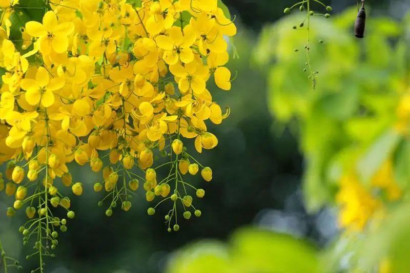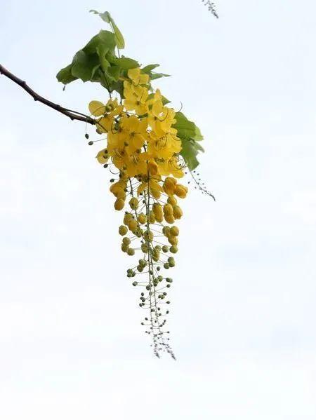 腊肠树,落叶乔木。总状花序下垂,花冠鲜黄色。荚果圆柱形,果熟时呈黑褐色,酷似农家晒的腊肠,由此得名“腊肠树”。