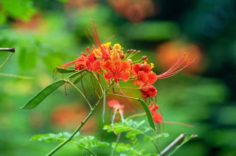 金凤花,落叶灌木。伞房式总状花序顶生,花冠橙红色,边缘金色,皱波状,花丝红色,伸出花冠之外。开花期间缤纷艳丽,花瓣似蝶翼,花丝似蝶须,远看宛如一群群彩蝶在绿叶中飞舞。