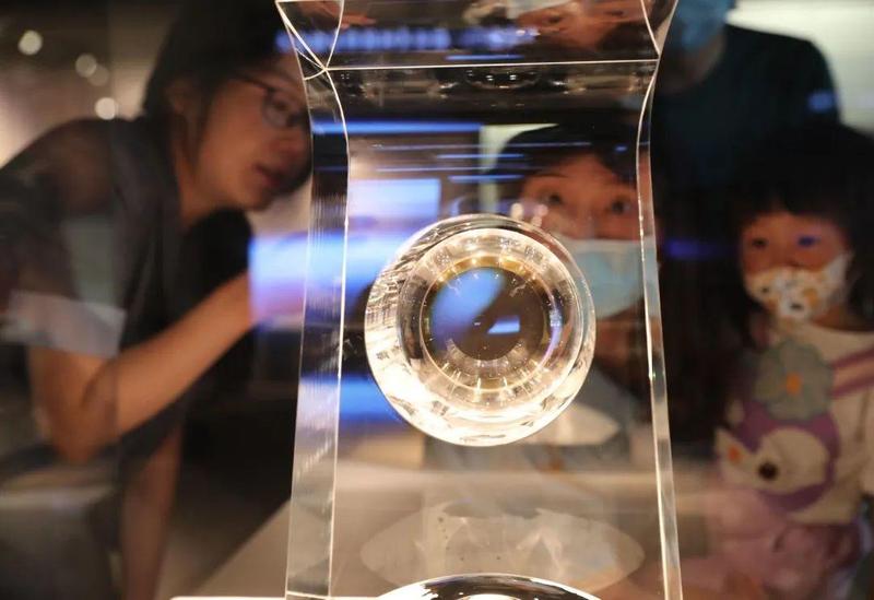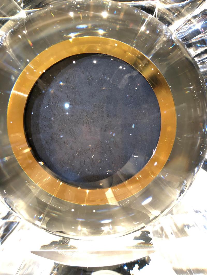 据了解,这个月球样品的容器材质为人造水晶,整体造型借鉴自国博馆藏的系列青铜“尊”造型,以体现稳重大方之感。整体外部造型高38.44cm,象征地球与月亮间的平均间距384400km,整体外部造型宽22.89cm,象征嫦娥五号自发射到返回的任务时长22.89天,从时空两个纬度展现中国探月领先地位。