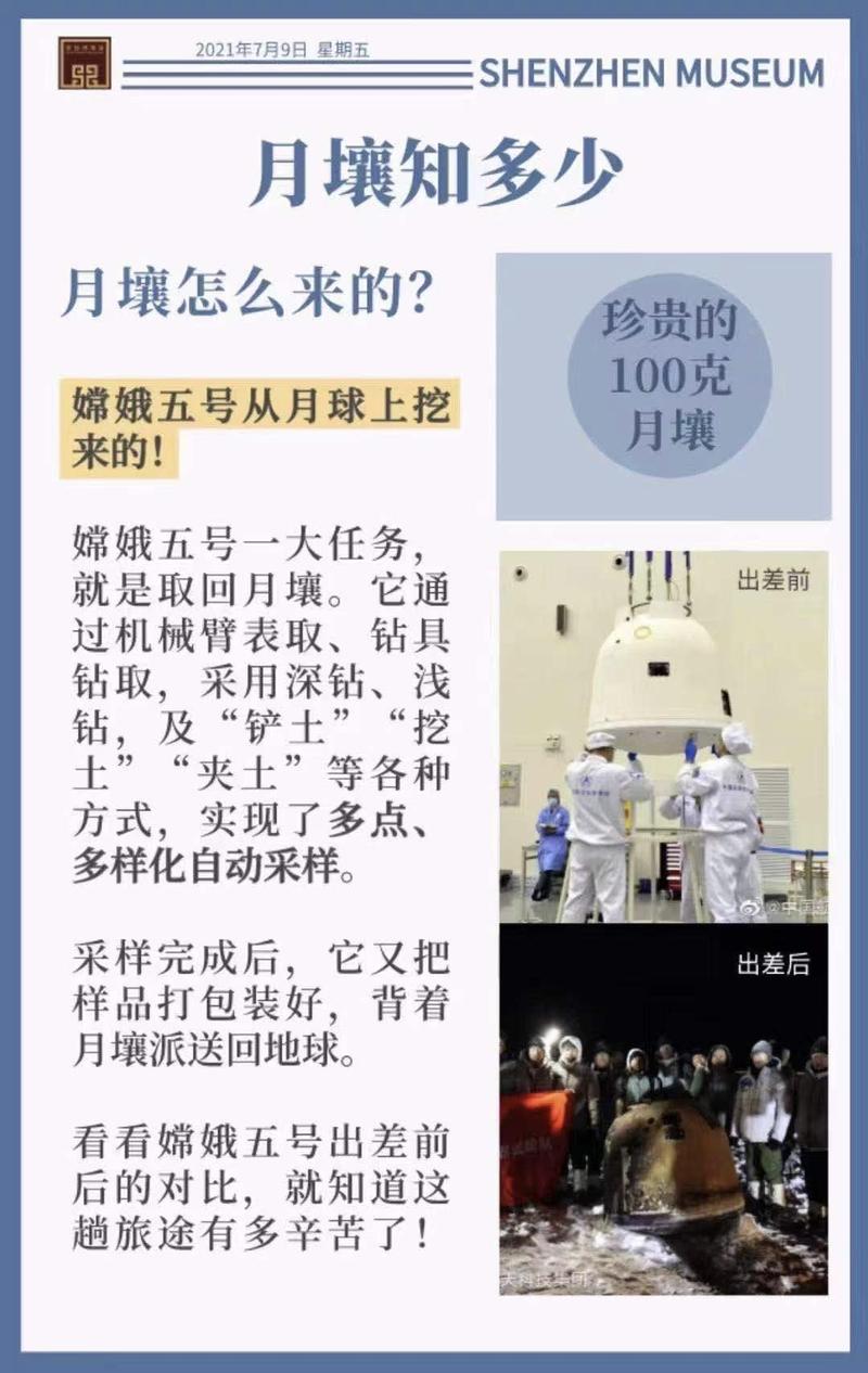 1978年12月,中美建交前夕,美国送给我国1克月岩,那时美国早已获得300多千克月壤和月岩。几天后,党的十一届三中全会召开,我国开始改革开放,深圳作为改革开放的排头兵和试验田,为改革开放打了前阵。四十年后,我国可以自己九天揽月,“嫦娥五号”带回的1731克月壤,100克放入我们的展厅里来展示,深圳也成了改革开放的示范区,一跃从小渔村成为国际化大都市。月壤的获取和深圳特区的建成都是我国从无到有改革开放不懈奋斗的伟大成就,都实现了质的飞跃!