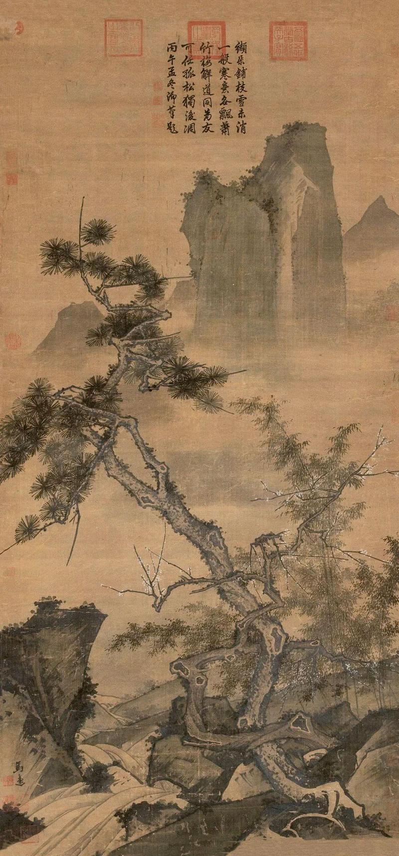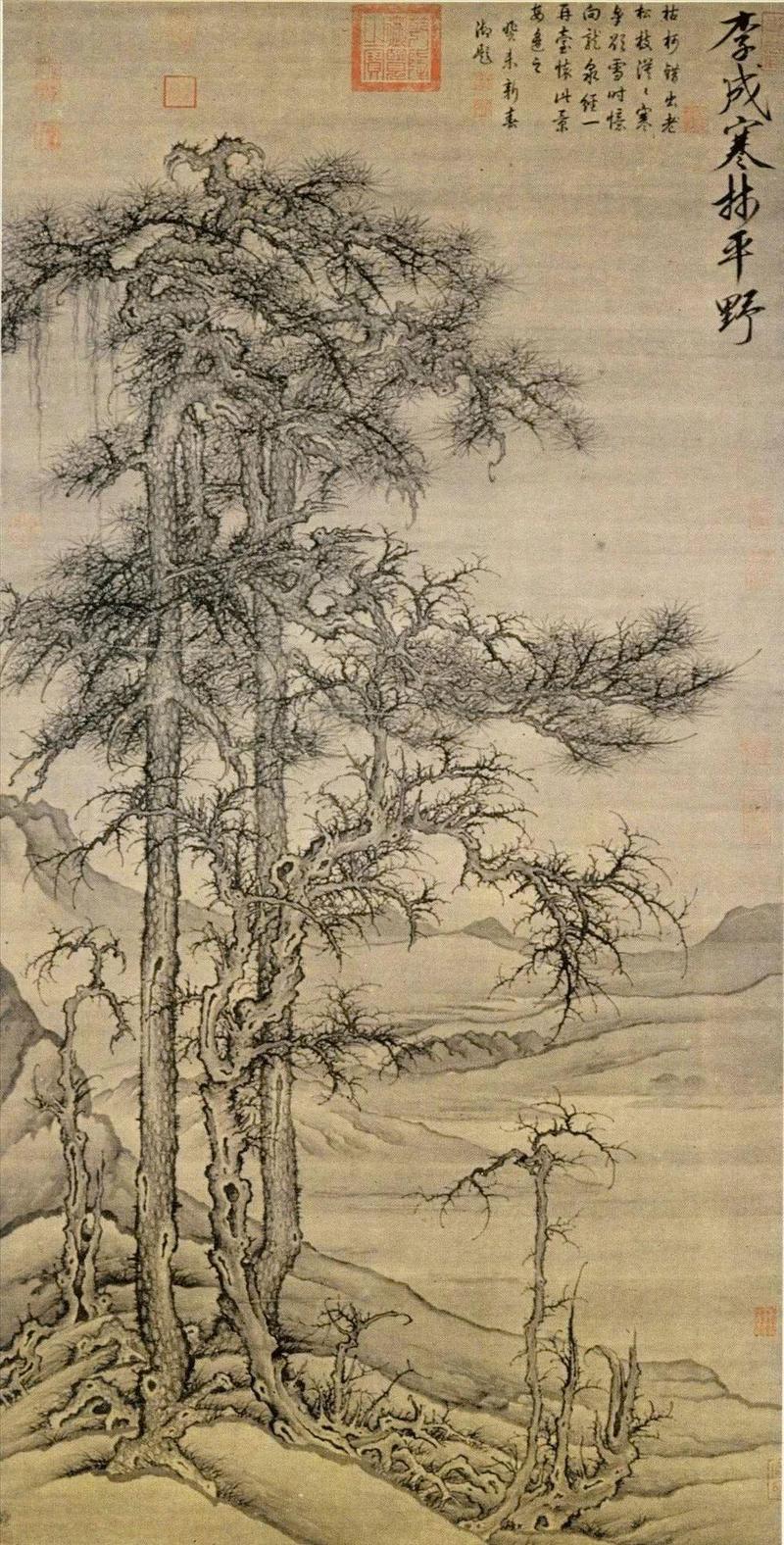 在他的《寒林平野图》中,乍一看尽是枯枝寒树、荒山冻水,无比萧瑟孤苦。然而“蟹爪”法绘出的虬曲树枝,每一寸弯曲处都蕴含着不屈的力量;用“攒针”法表现的松叶,则线条刚直坚韧。