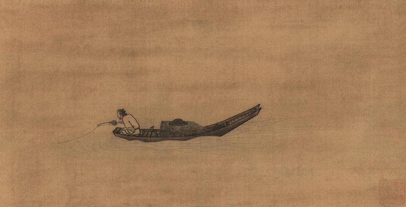 他便是马远,《寒江独钓图》的作者。画中,只一叶扁舟,几圈细细的水纹,一人独钓,其余皆是空白。