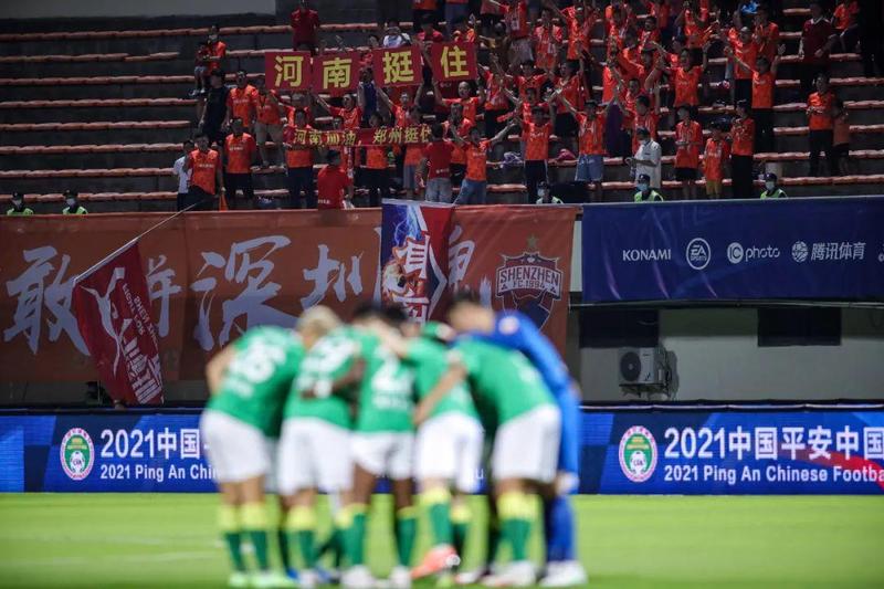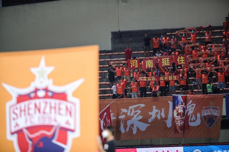 比赛开始前,深圳队球迷在看台上高举“河南挺住”“河南加油,郑州挺住!”的标语,为遭遇持续强降雨的河南人民鼓劲。