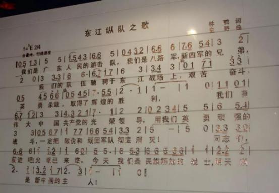 “我们是广东人民的游击队,我们是八路军、新四军的兄弟,我们的队伍驰骋于东江战场上,艰苦奋斗、英勇杀敌,取得了辉煌的胜利。我们有伟大中国共产党的光荣领导,用我们英勇顽强的战斗,一定把敌伪和顽固军队彻底消灭,同志们,前进吧!光明已来临,今天,我们是民族解放的战士,明天啊,是新中国的主人!”这首歌叫《东江纵队之歌》,是东江纵队的队歌,一首斗志昂扬的红色赞歌。这首歌表现了东纵战士们浴血奋战、英勇抗敌的革命精神,唱出了东江纵队英勇杀敌、赴汤蹈火的英雄气慨。