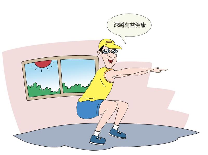 深蹲要领:立正站好,两脚与肩同宽,自然呼吸;下蹲,同时呼气,两手向前自然平伸至水平位,下蹲时膝盖不要超过脚尖,如果超出会加大膝关节压力,容易伤关节,可以想象后面有个幼儿园小孩坐的小凳子,有人说,请坐,你背部挺直前倾坐下去。起身,双臂下放至腿边,同时吸气,连续做十几次试试,做不动了不要坚持。可以在家里到处走走,几分钟后,到床上或沙发上做仰卧起坐。