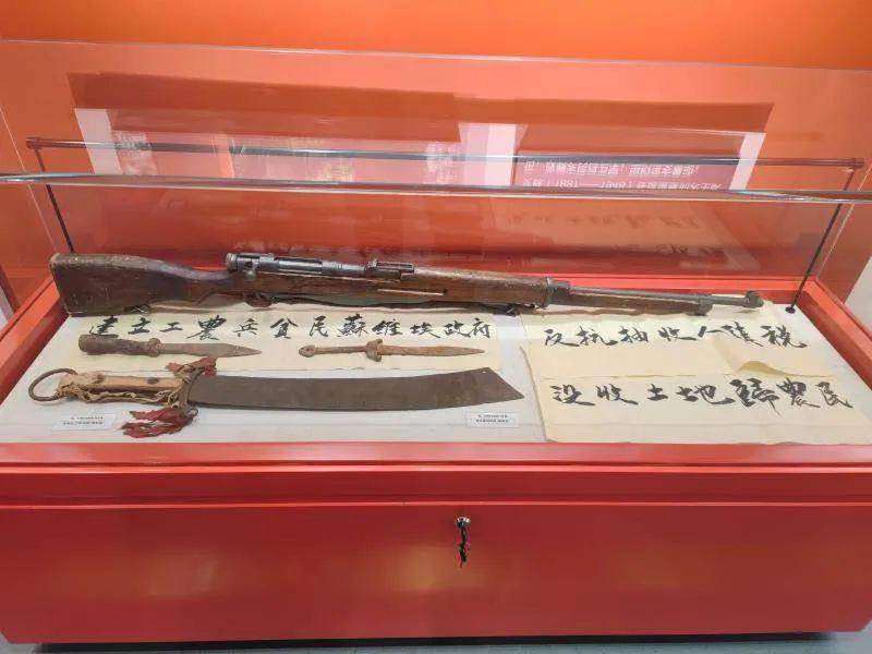 图为农民自卫武器及“反抗恢复民团”“反抗抽收人头税”“建立工农贫民苏维埃政府”“没收土地归农民”标语。