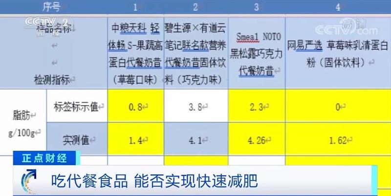 经检测,10款代餐粉中有4款标注的营养指标与实际检测值不符,比如某品牌代餐,外包装上写着脂肪标称0g/100g,但实际却检出1.62g/100g。此外,通过与《代餐食品》团体标准对比发现,大部分品牌的样品,存在不同程度的能量或营养素偏低的情况。在减肥效果方面,40名测评官一周平均减重2.2斤,但大部分人出现拉肚子、肠道不适等症状。