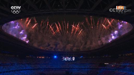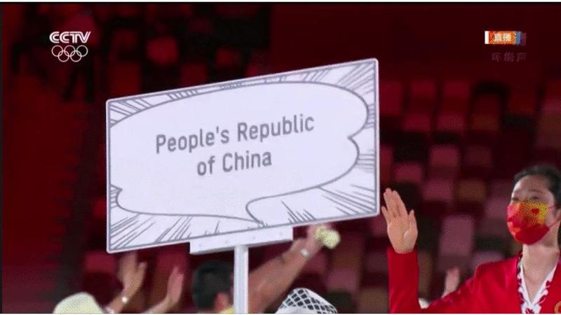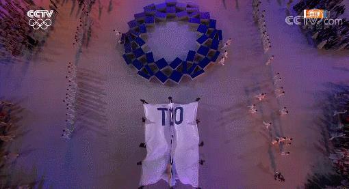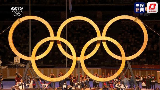 在开幕式五环展示仪式上,带有东京奥运会会徽的灯笼引导巨大的木制圆环缓缓进入场内。三个巨大的木制圆环出现在场地中央,开始东京奥运会开幕式上的五环展示环节。