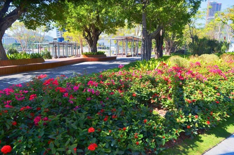 五颜六色,朵朵争艳。延长段在重要节点,共新增了3处特色花林带,还根据不同季节,种植了珊瑚刺桐、红花玉芙蓉、凤凰木、宫粉紫荆等等数十种极具观赏性的植物,生态优美。