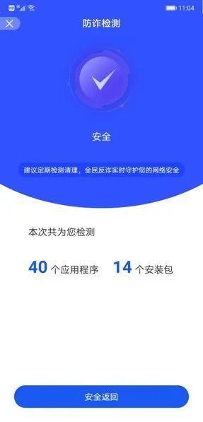 您可以通过全民反诈APP快速检测已安装应用和未安装应用安装包,帮助您精准识别手机内可疑诈骗应用。