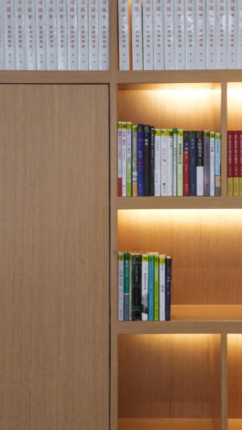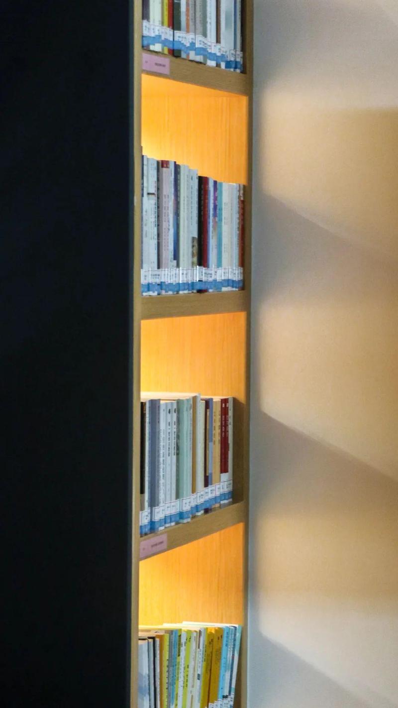 图书馆自然是少不了书的,五楼阅览区总体面积200m²。区域划分为两部分,分别是成人阅览区和少儿活动区。成人阅览区由一面书墙隔断成两个区域,一面三面书墙环绕,一面和旁边的少儿活动区相邻,视野开阔。