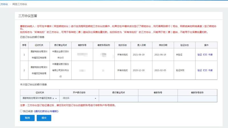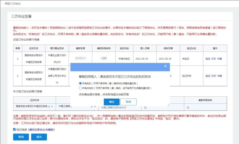 注意:缴款账号名称与纳税人名称不一致。请打印《委托扣款协议书》,并一同携带纳税人营业执照或组织机构代码复印件、缴款账户开户资料等银行要求查验的材料,前往对应商业银行继续办理三方协议签订业务;银行办理完毕后,若协议状态不为“验证成功”的,请在电子税务局【网签三方协议】中发起“验证”操作。