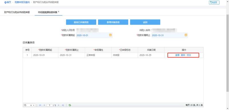 税源信息采集后,可以选择操作列链接,未申报的税源信息可进行【查看】、【删除】、【修改】操作,已申报的税源信息可进行【查看】操作。