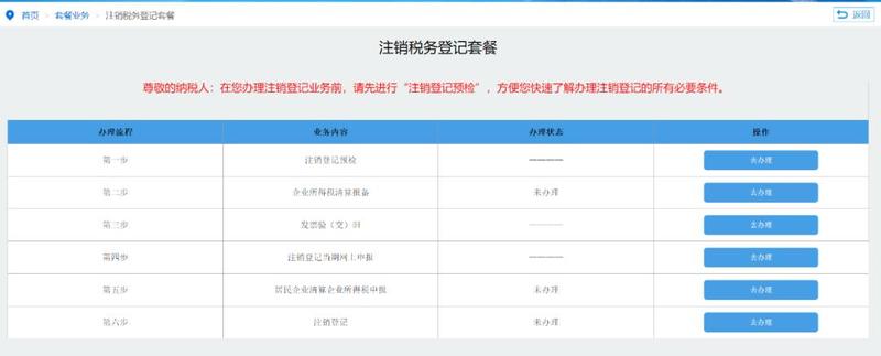 推行“注销税务登记套餐式服务”,注销预检在先、全流程网上办为主、关联业务智能联动,对符合注销即办资格的纳税人自动启用简易注销流程;对适用一般注销流程的企业,按照业务逻辑整合6项业务为一个套餐。