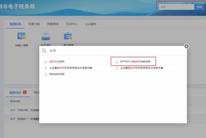 1.登录电子税务局-右上角搜索栏搜索关键字,如【合并】。