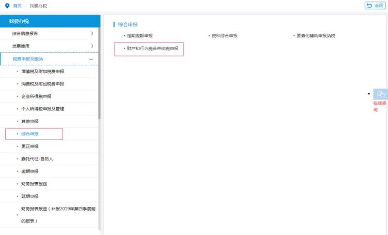 2.登录电子税务局-【我要办税】-【税费申报及缴纳】-【综合申报】-【财产和行为税合并纳税申报】。