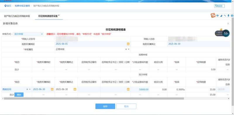 如果未认定印花税税种信息,税款所属期默认为按次申报,税款所属期只能选择一天;如果印花税税种认定为按月申报,则税款所属期默认为一个月。