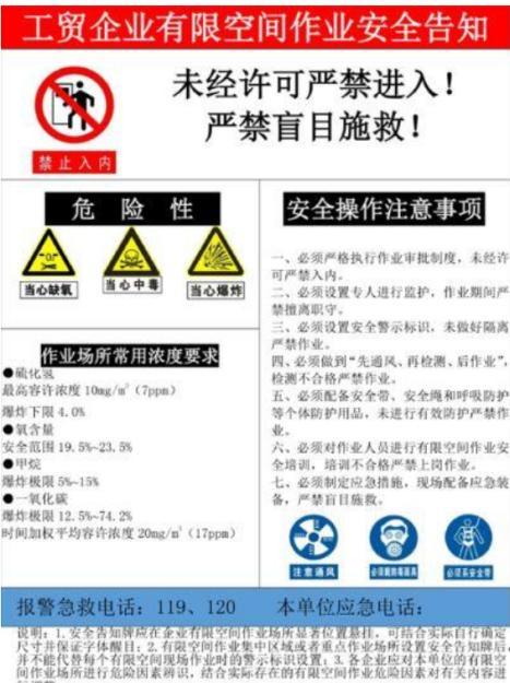 在有限空间进入点附近设置醒目的安全警示标识,告知作业者存在的危险有害因素和防控措施,同时明确有限空间现场作业负责人、作业人员、监护人员及检测人员的职责,不在没有监护人的情况下进行作业。同时,对从事有限空间作业的相关人员应进行有限空间存在的危险特性和安全作业的要求、进入有限空间的程序、检测仪器和个体防护用品等设备的正确使用、紧急情况 下个人避险常识、中毒窒息和其他伤害的应急救援措施等内容的培训,以提高从业人员 安全意识和自我保护的能力。