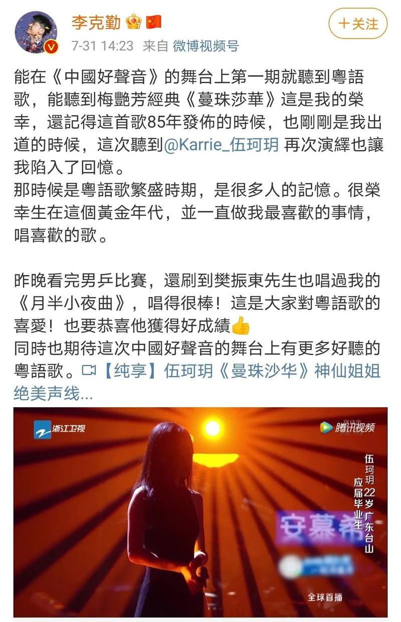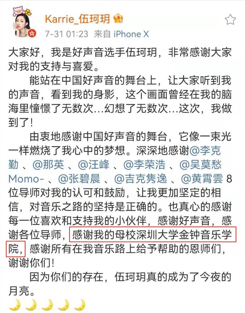 而在初舞台后,伍珂玥也在微博上发文表达感谢,其中就包含了对母校及老师的感谢。