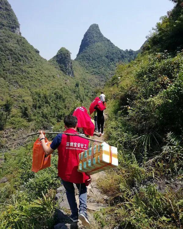 2019年9月27日,大化社工站社工到大化县板升乡弄冠村弄珠教学点进行手工工作坊活动,因弄珠未通公路,社工只能靠肩扛手提活动物资到活动场地。
