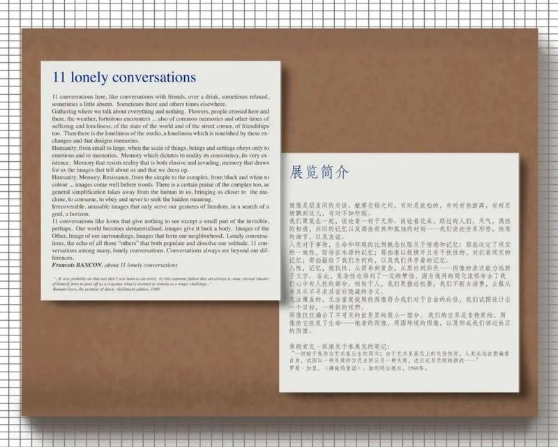 本次展览共分为11个章节,每个章节都是艺术家与自己的对话,抒发了他通过观察、感受和分析周围的世界而引发的哲思。公众在被邀请来观看和阅读这些图像时,也在与作品进行无声的对话。对话使人们在孤独中相遇,正如吉尔·德勒兹(Gilles Deleuze)所说,"正是在这一孤独的背景中,你们才能实现任何一种相遇。你们与不同的人相遇(而且有时没有认出他们,也从未见到他们),当然还与运动、观念、事件、实体相遇。"像所有对话一样,它们可以是无聊的,也可以是令人兴奋的…·这取决于认知、喜好和当下的思绪。这 11个对话有不同的语气。大部分呈现为传统的博物馆布置,作品需要从一定的距离观看,其他的需要氛围,特定的光线,或需要公众的互动。总体来看,这是一个双重的对话,包含了艺术家与他自己的对话,以及公众与图像之间的对话。