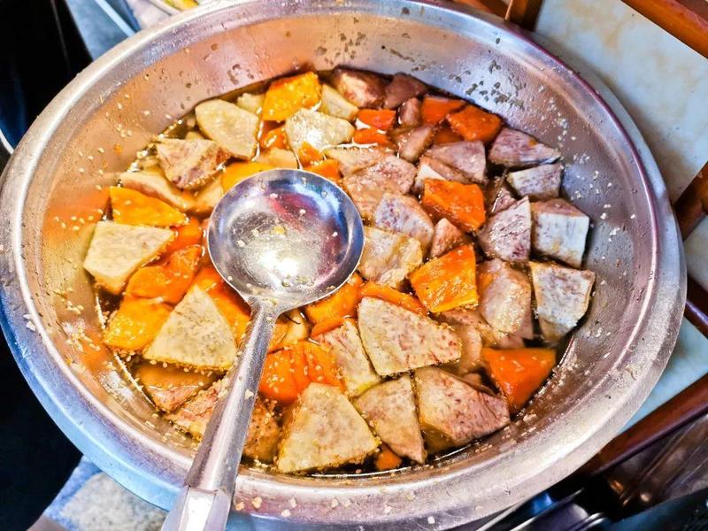 潮汕爱甜,甘蔗大把大把的种植,看家甜品之一就是“糕烧”系列。例如当地常见甜品糕烧番薯芋,将番薯和芋头切成块,再用等量的糖进行腌制——对,用糖来脱水,基本就是一碗蜜饯,你说甜不甜?
