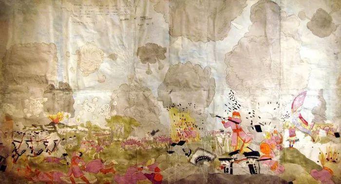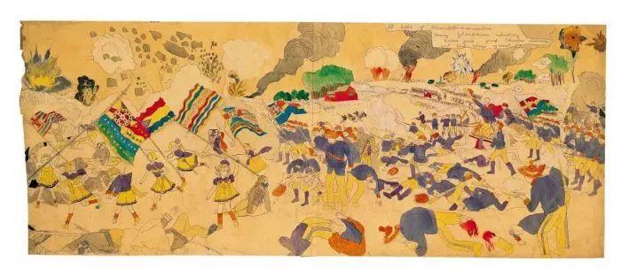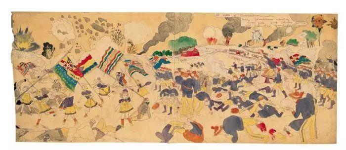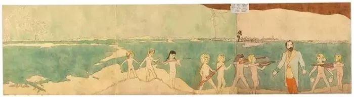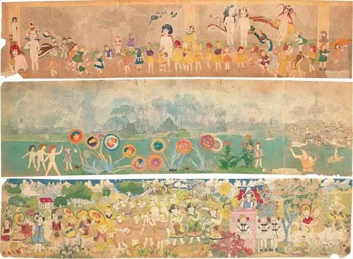 纸的两面都画满了不同的场景和情节,有些画作竟然长达3米,那些画稿充满奇异诡谲的色彩。