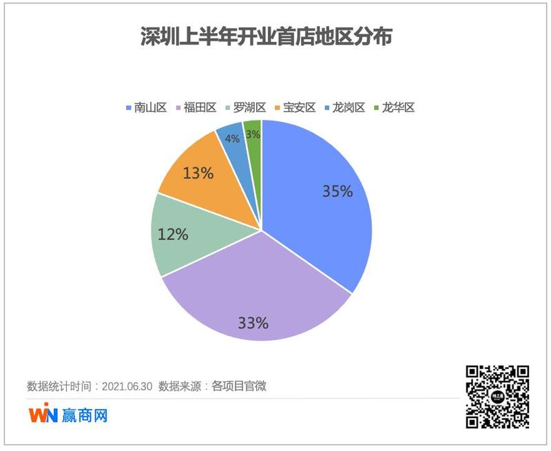 根据赢商网数据,2021年上半年福田区和南山区“两家独大”,分别进驻首店24家和25家,接下来是宝安区、罗湖区各9家,龙岗区和龙华区进驻首店3家和2家。