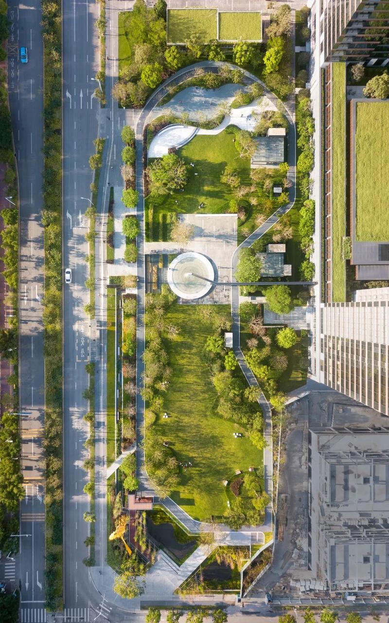 深圳深湾街心公园建立了完整的公共空间体系:多元的公共绿地空间+宜人的步行社区+完善的城市慢行系统,将所有消极空间、建筑灰空间均设置成口袋公园、街角公园,提供人性关怀。公园北侧地铁站广场,集成地铁口风雨连廊、出租上车落客、公交等候停泊、过街红灯等候、街角林荫遮阴、自行车停放等功能,满足行人交通穿越及换乘等候需求,实现了地铁换乘、站前集散、公交等候、步行过街等一体化完整而顺畅的城市步行系统。