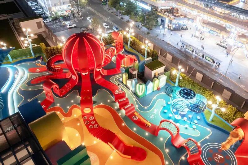 在这个章鱼王国里满是玄机:攀爬网、螺旋滑梯、漩涡雨伞、多彩胶囊、海盗望远镜、绿植迷宫等。