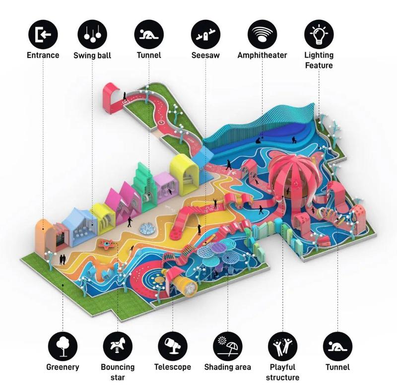 7米高的章鱼头,作为主要的IP游戏对象出现,从周围的所有建筑物都可以看到,而它的8条波浪形蜿蜒的触手是地面挑战活动和障碍的趣味课程,帮助孩子们发展他们的身体能力和通过游戏学习的认知技能。