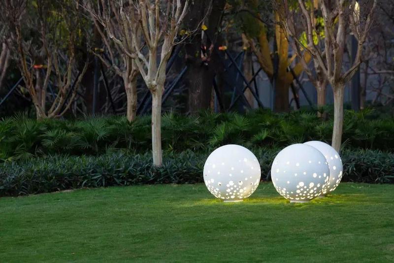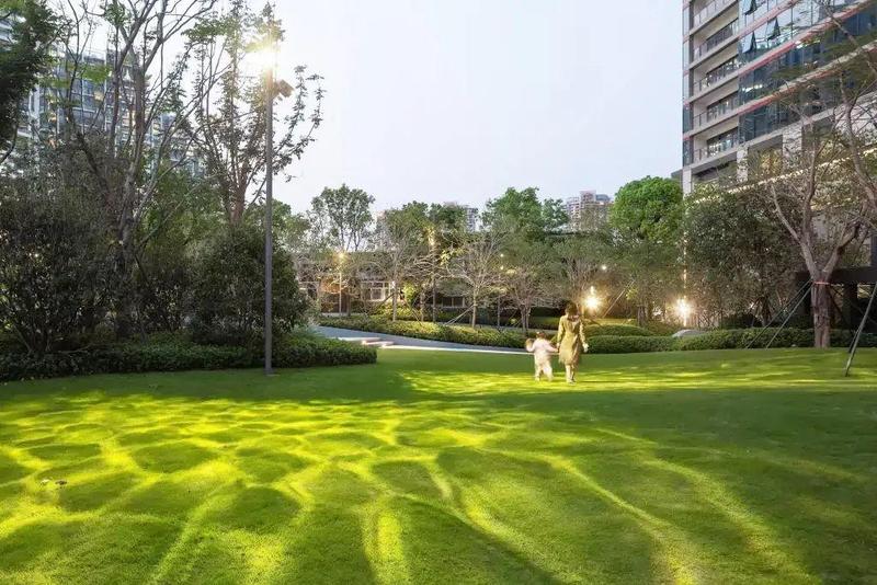 夜晚,水波纹灯光将草坪变身为海洋,社区交流场氛围变得柔和,连风也慢了下来,疗愈都市人高压工作下的疲惫的身体。