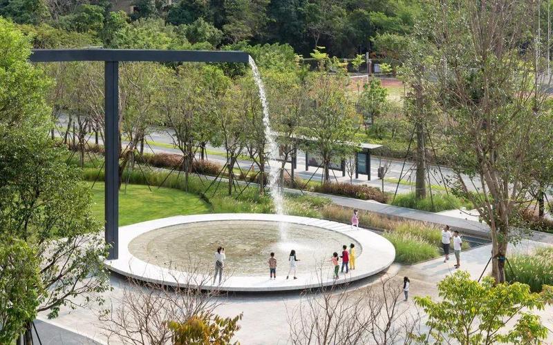 水渠桥跌瀑溅起的水花,是孩子们的最爱,他们尝试各种方式与它进行互动。水磨石圆形水景由工人师傅精心打磨,不留下一个锐角,避免儿童在玩水过程受到磕碰。
