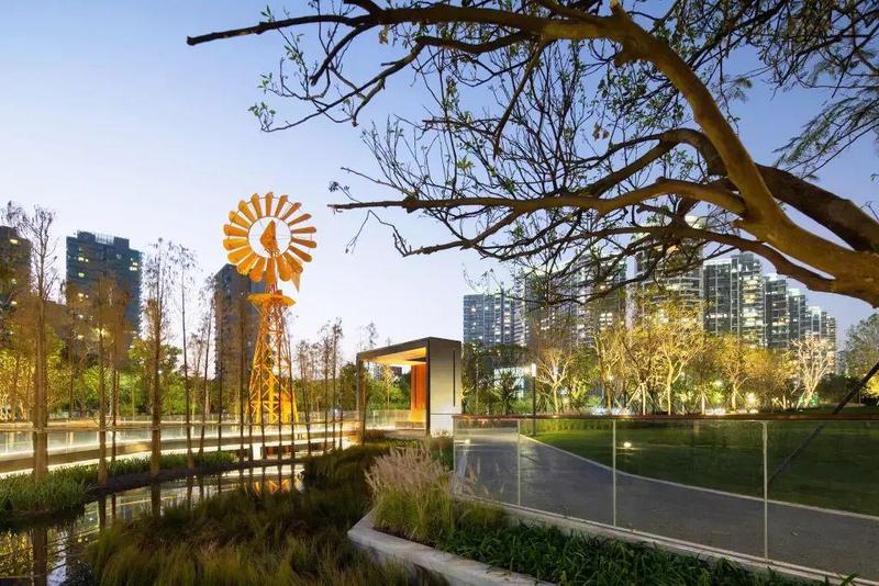 深圳深湾街心公园以生态方法蓄水、净水,需要时将水加以利用,雨水蓄水池容积为283.5m³,雨水日径流可收集总量为665m³,收集的雨水可用于绿化浇灌和景观补水。海绵系统利用自然做功,实现了自然系统中雨水、风能、动能的循环利用。场地内别具一格的标识性风车,可将风能转化为动能,把湿地中蓄积的雨水抽到水渠桥,成为水景观的起点。10m高的飞瀑下落,经层层台地的滞留、净化,形成叠瀑景观,最终重新回到湿地的水循环中,滋养浇灌湿地水景。