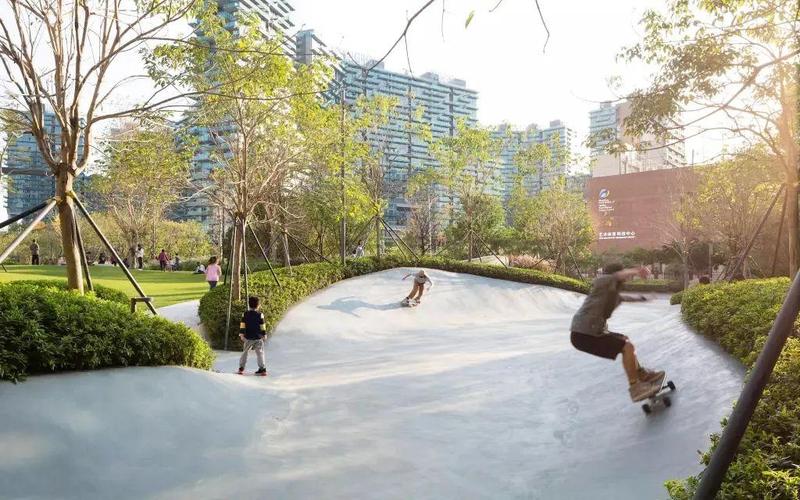 北侧杜鹃绿丘中滑板场若隐若现,灵动的滑板场地采用清水混凝土材质,激发了不同年龄段运动者的热情,他们在场地尽情挥洒汗水,分享运动的快乐。宠物乐园的白沙坑是爱宠人士和宠物们的新聚落,同时也是孩子们喜爱的场地。