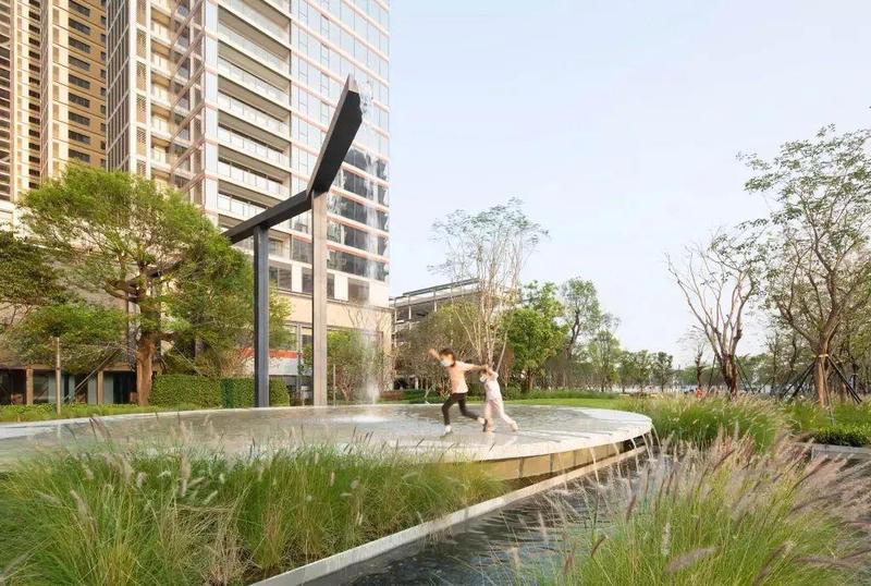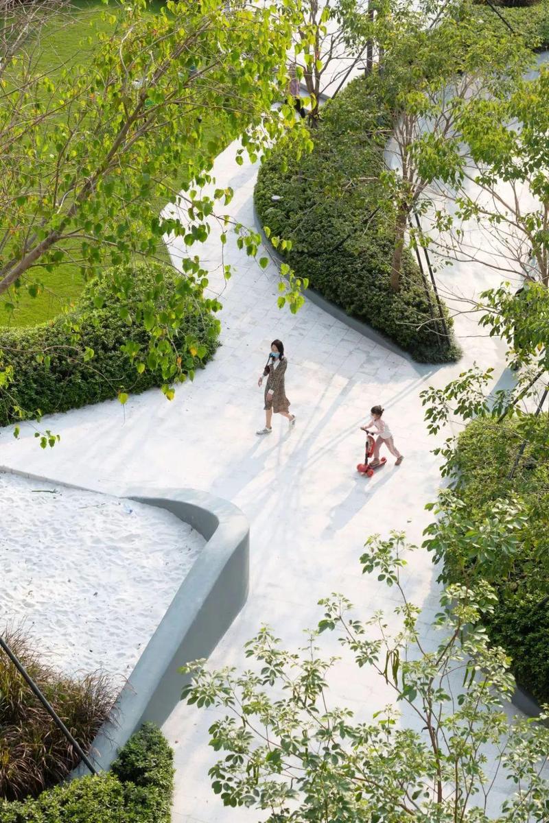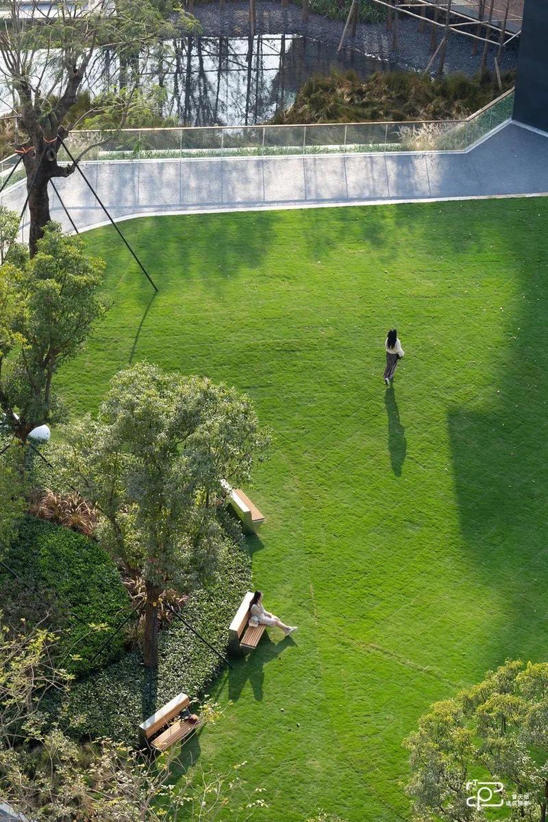 公园中心3500㎡的草坪,围合以树林和芒草,让置身其中的居民短暂的与城市隔离,沉浸于树林、光与清新的空气里。不设限的开放场地,吸引居民以最舒适的方式展开与自然的对话。在林荫下、芒草旁,总能找到放松自我的角落,人们惬意地躺在草坪上,和朋友家人一同分享生活的趣事。