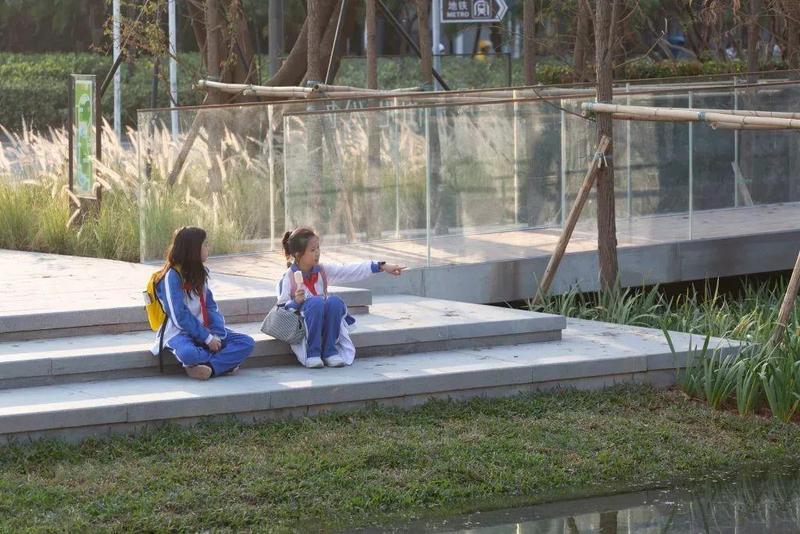 用来沉淀过滤水质的砾石水杉林湿地里,甚至出现了蝌蚪,也能听见蛙鸣声。天光云影,虫鸣蛙叫,这里一切的活力与生机,都将成为孩子们可贵的童年记忆。