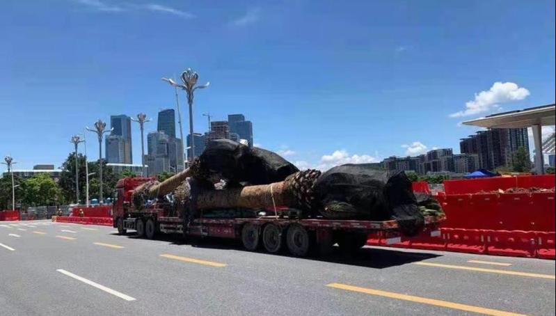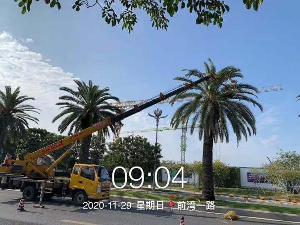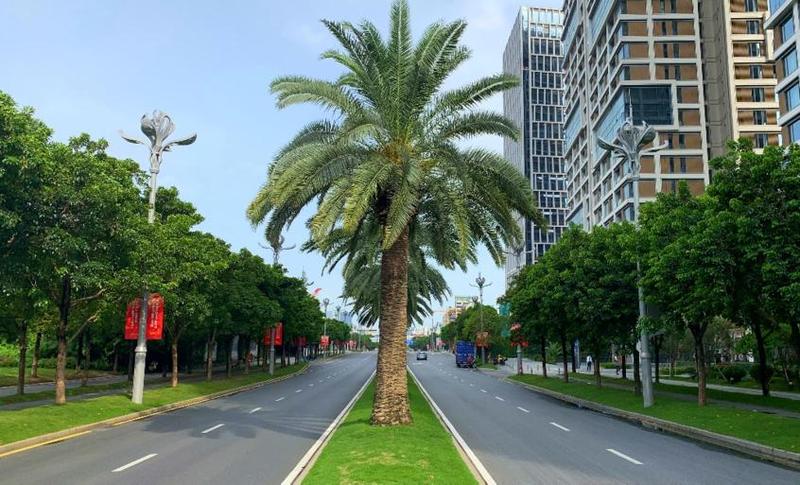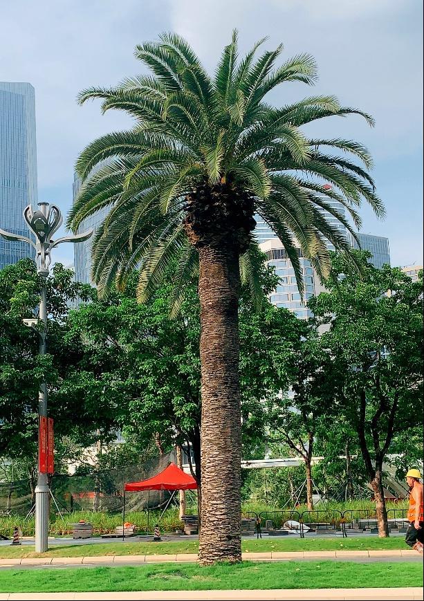 本次采用的加那利海枣苗木树高5.5-7.5m,地径0.8-1.1m,植株高大雄伟,形态优美,适合生长温度为-10℃至38℃,是街道绿化与庭园造景的常用树种。经过4年的精心养护,97棵加那利海枣生长健壮,已成为前海区域最具特色的城市名片。