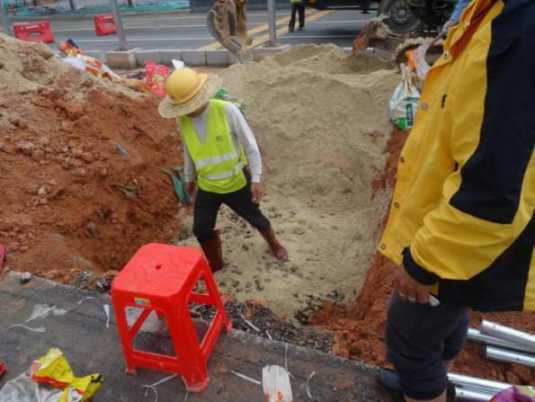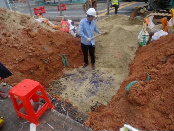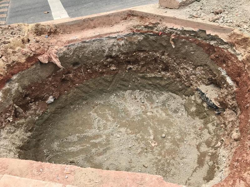 根据土球大小确定树穴的开挖深度,树穴开挖深度一般为土球大小外扩500mm,本项目加那利海枣树槽开挖深度为1.5m,宽为2m。因需铺设透水管,需预先开挖沟槽,确定开挖深度后进行树槽开挖。前湾一路土壤容重、孔隙度、营养物质等指标均无法达到加那利海枣生长要求,因此开挖土壤需要外运,回填应采用合格的种植土。