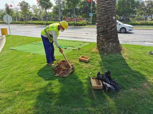 对前湾一路加那利海枣进行钻孔施肥