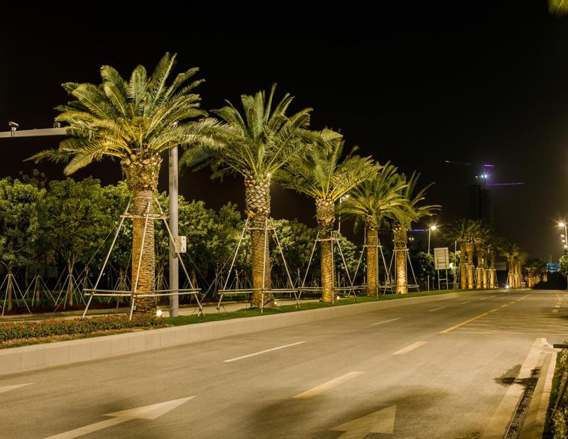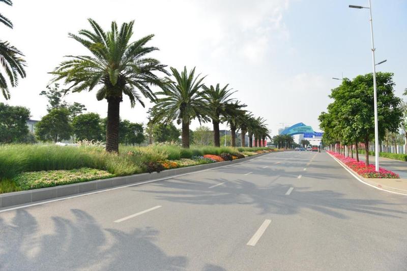 前湾一路景观廊道市政工程(景观部分)位于前湾一路,在前湾一路中分带种植97棵大规格加那利海枣,营造一种舒朗、通透、大气的园林绿化景观,展示出前海合作区朝气蓬勃、开放包容的创新之城形象。