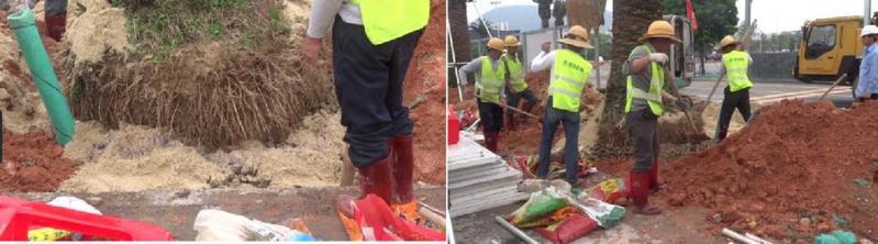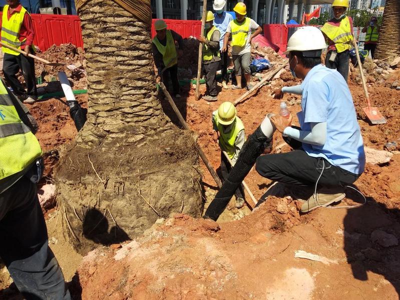 在调整加那利海枣位置和方向的同时,将两根包了防水土工布的DN15探测管放置在土球与树坑之间,放置好探测管以及调整好大树位置后,开始沿着土球周围撒沙子,厚度为10-15cm左右,然后再放置一层15cm左右塘泥,放置完成后,安排两至三个工人同时用木棒将塘泥压实。