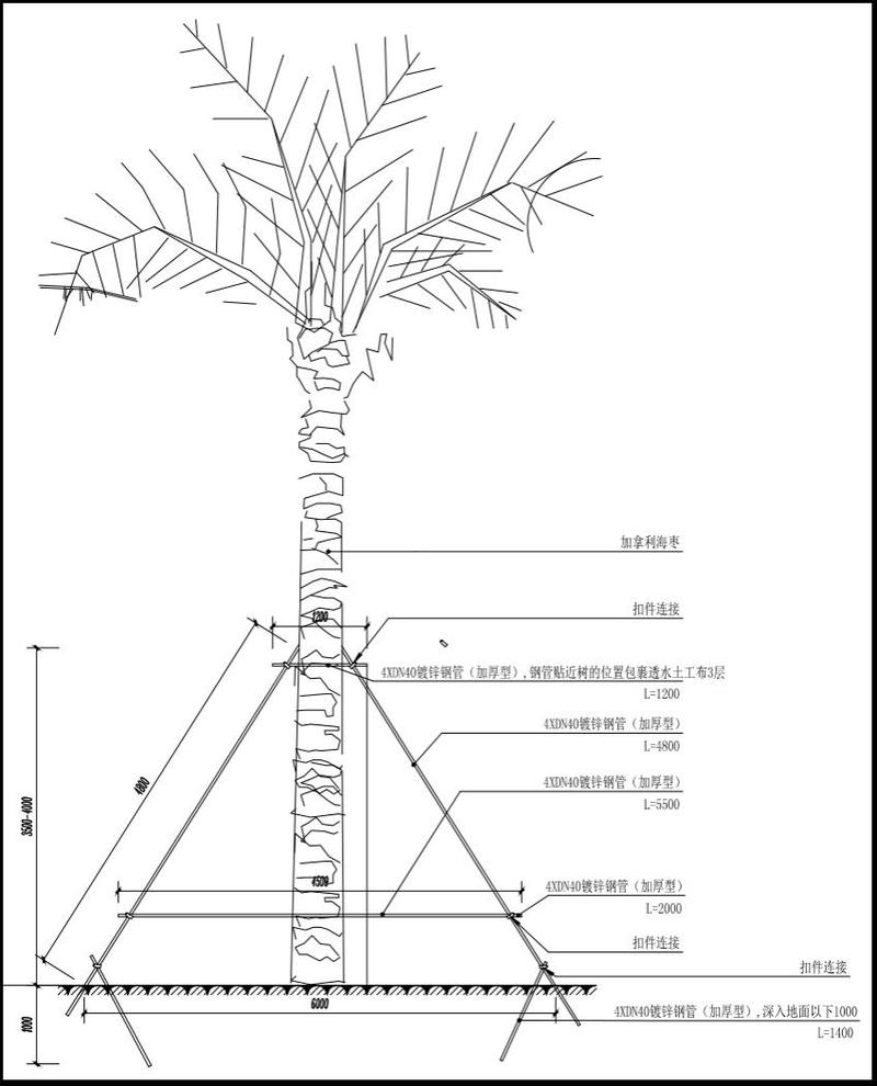 为避免加那利海枣在台风后出现倒伏、断裂等现象,根据道路环境以及加那利海枣的规格尺寸采用四角支撑,材质为镀锌钢管。四角支撑由第一四角支撑框、第二四角支撑框和斜拉杆之间相互配合支撑,各部件之间以组合扣件进行连接。第一四角支撑框的四周贴近海枣树的位置包裹3层透水土工布,钢管地面跨度距离宜为3000mm,支撑点在树干距地面3500~4000mm位置,钢管与树干之间的夹角为30~45°。