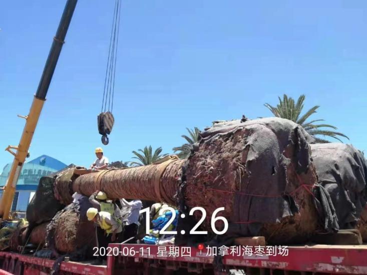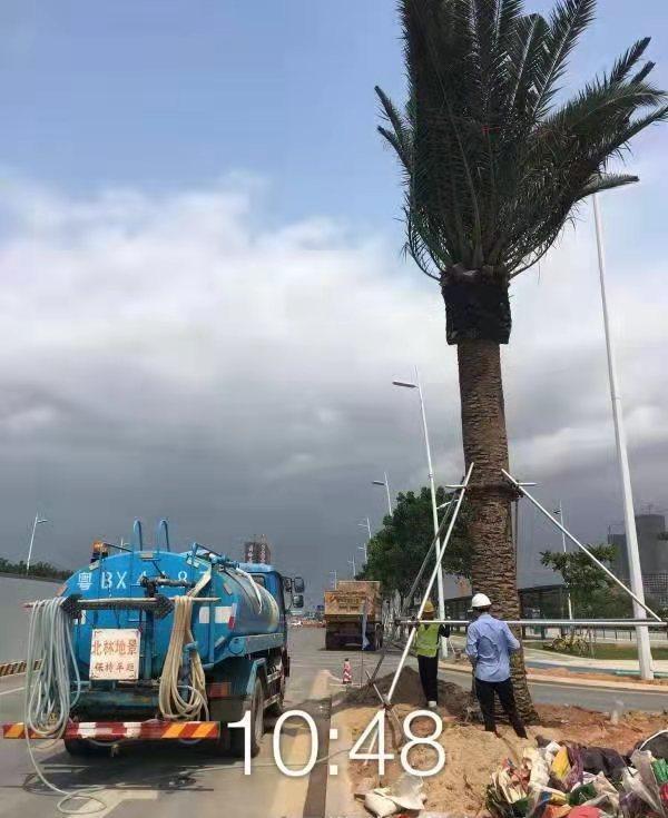 起苗时,加那利海枣的土球大小应达到要求但又不宜过大增加运输难度,按照其胸径的2-3倍来确定土球的大小,为防止土球松散,需要用钢筋网来加以加固。在树叶的处理方面需要将树叶用塑料绳朝树干生长方向扎起来,避免运输过程中将树叶折断。