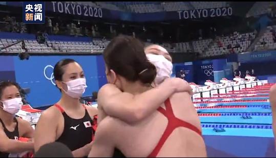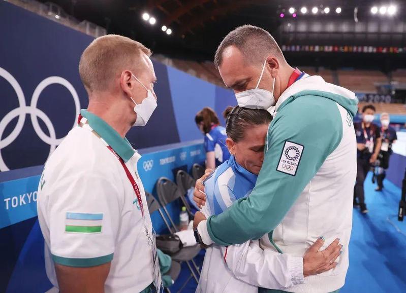 7月29日,何冰娇(红衣)在安慰哭泣的张蓓雯。新华社记者 杨磊 摄