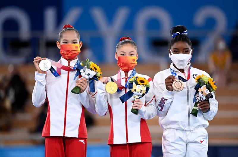 8月3日,女子平衡木冠军中国选手管晨辰(中)、亚军中国选手唐茜靖(左)与季军美国选手拜尔斯在颁奖仪式上。新华社记者 程敏 摄