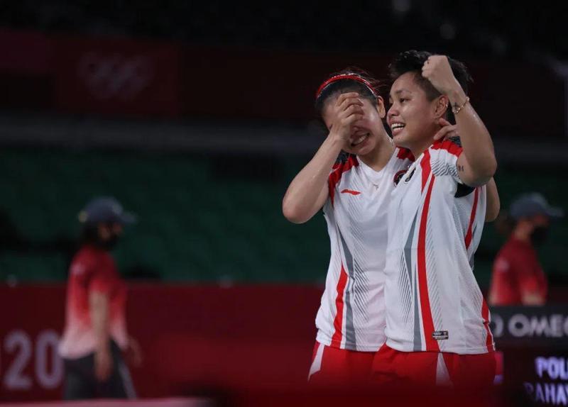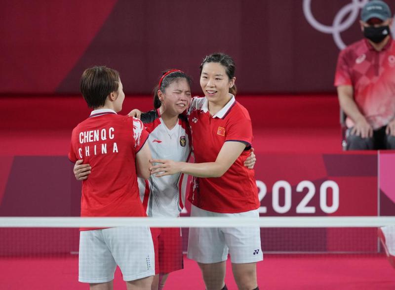 8月2日,陈清晨(左)/贾一凡(右)与波莉在比赛后。新华社记者 薛玉斌 摄