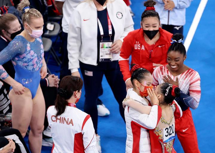 管晨辰和平衡木亚军唐茜靖激动拥抱