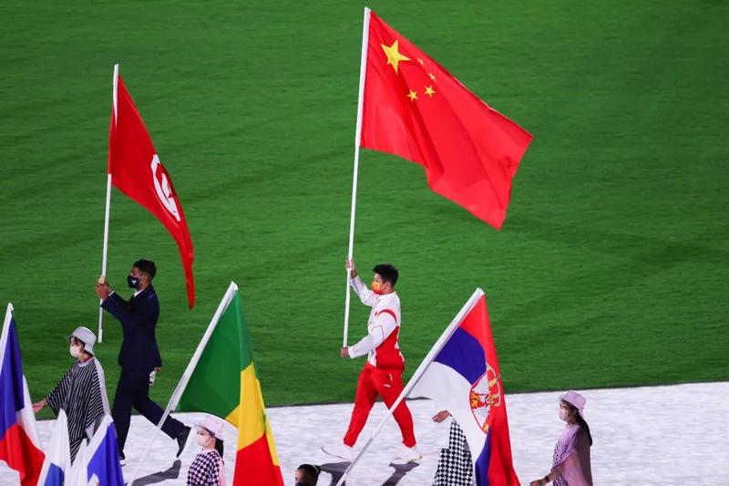 东京奥运会闭幕式上,中国体育代表团旗手苏炳添手擎五星红旗入场。