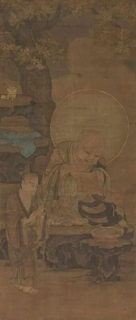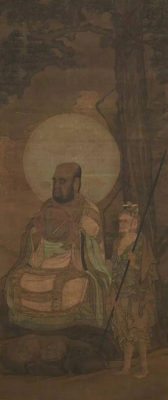 金大受,南宋时代浙江宁波具有代表性的佛画师。本图各幅有落款“大宋明州车桥西、金大受笔”,绘于庆元元年(1195)之前,当时的宁波被称为“明州”,作为现存浙江佛画中时代最早的作品而闻名。金大受所绘的罗汉笔锋收敛,形态把握准确,其赋彩也是巧用中间色,采用协调的自然表现手法,在宁波所绘制的罗汉图中也属于佳作。作为摄州多田院的镇院之宝而传来。曾为原邦造旧蔵。16幅作品中,现已确认有东京国立博物馆馆藏的10幅,以及群马县立近代美术馆馆藏的1幅,其他5幅估计流失海外,所在不明。